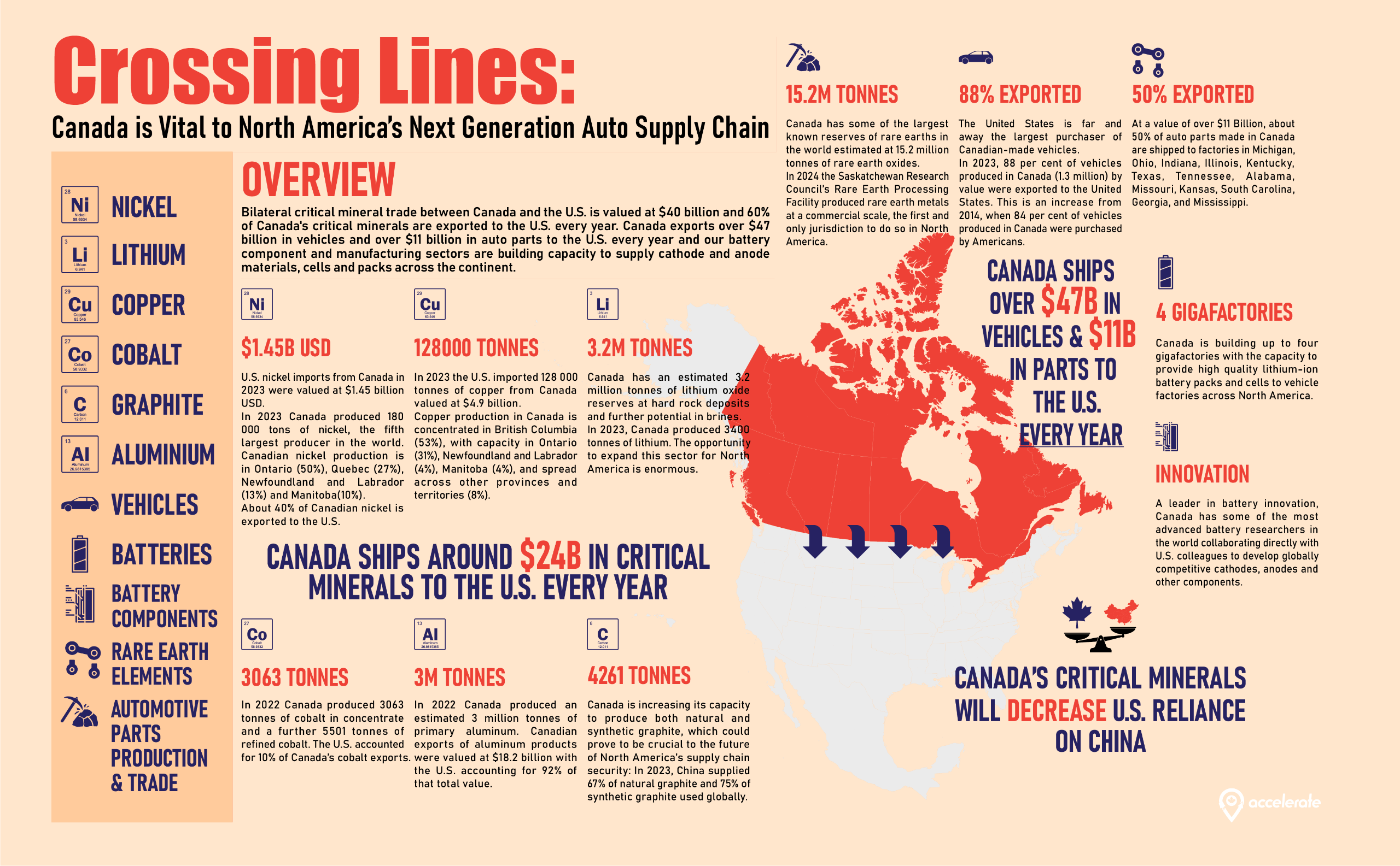 Bilateral trade in critical minerals between Canada and the U.S. is worth $40 billion annually, with 60% of Canada’s exports heading south. Canada also exports $47 billion in vehicles and $11 billion in auto parts to the U.S. each year, supporting thousands of jobs in states like Michigan, Ohio, and Indiana.
